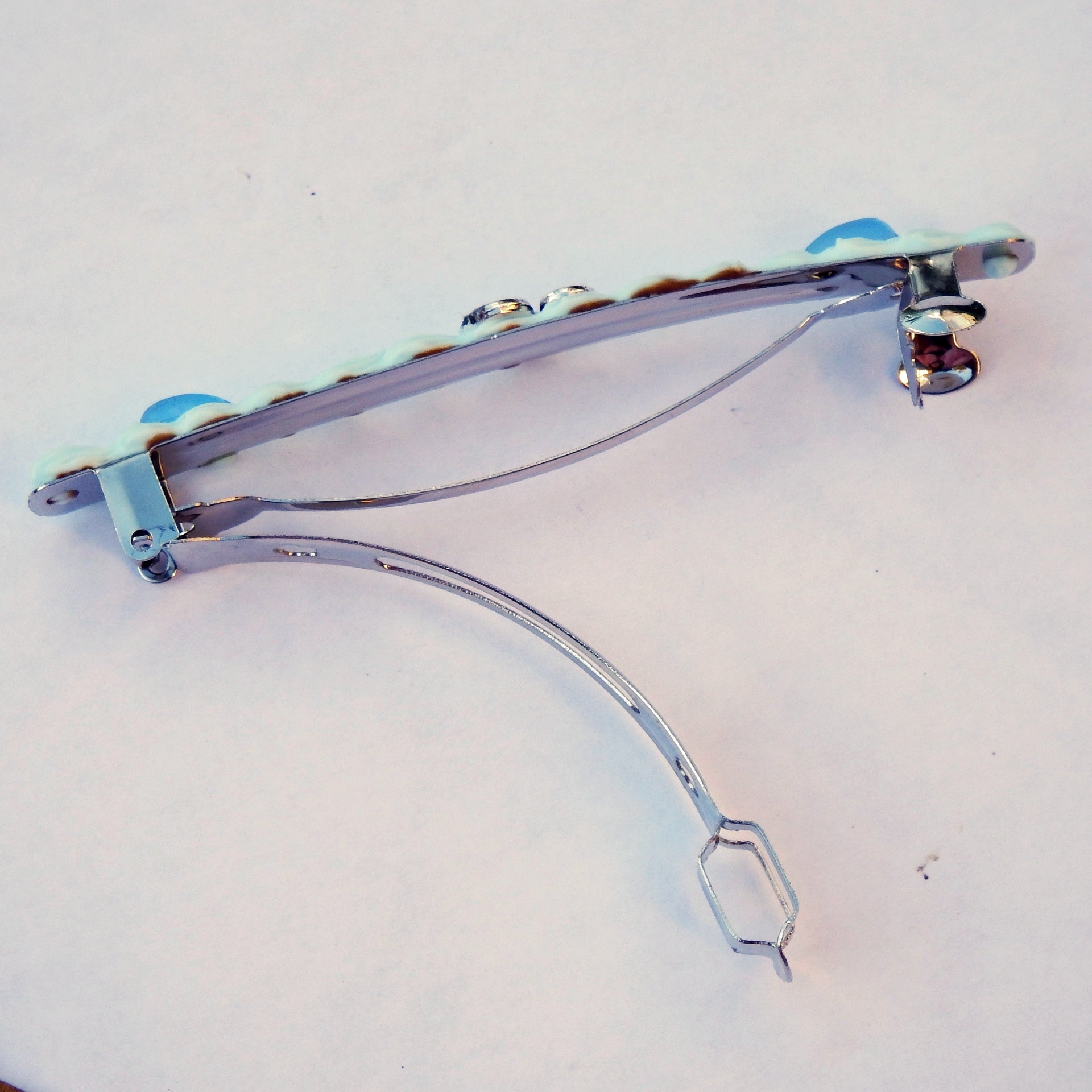 Barrettes en métal de 10 cm, avec décorations artisanales en colle-crème ou résine ou émaillé - Pièces uniques. envoi gratuit en France si inférieur à 200g ou commande supérieur à 50 euros.