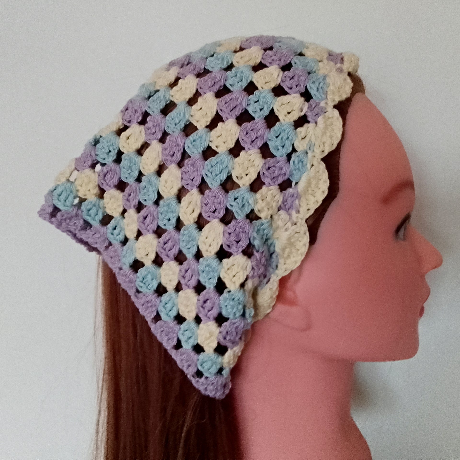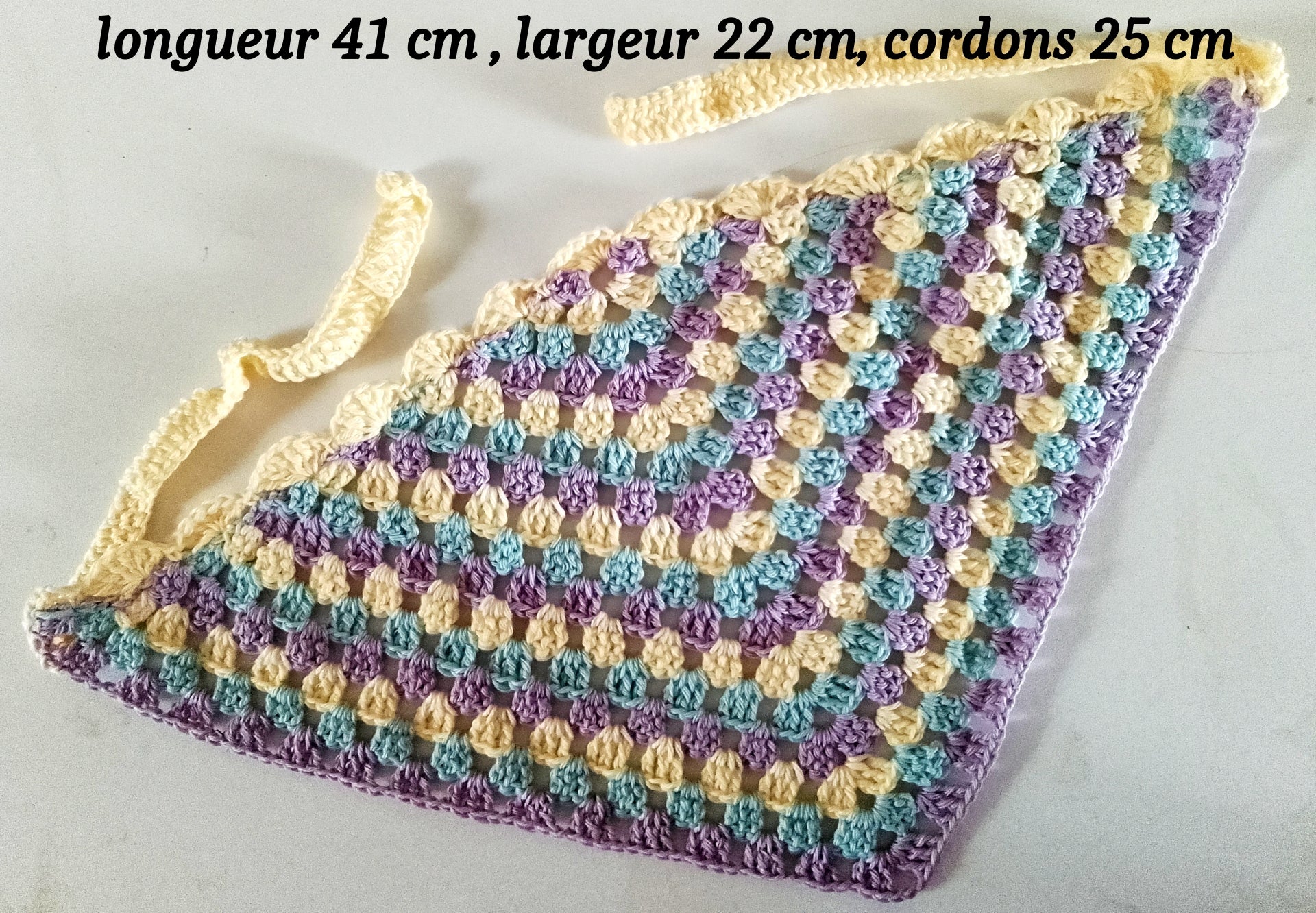 Bandana en fil de coton fait au crochet en points granny , longueur indiquée sur l'image du modèle