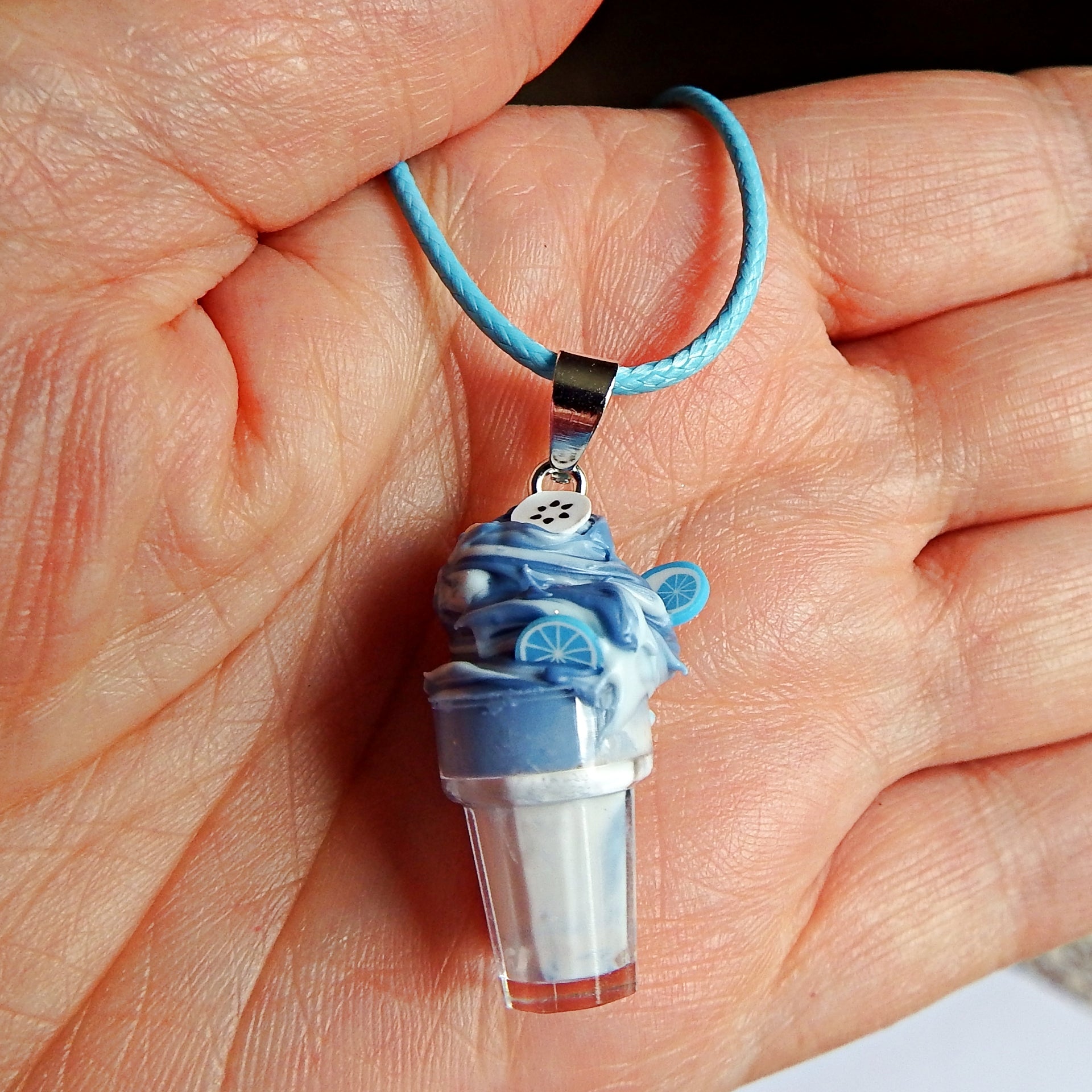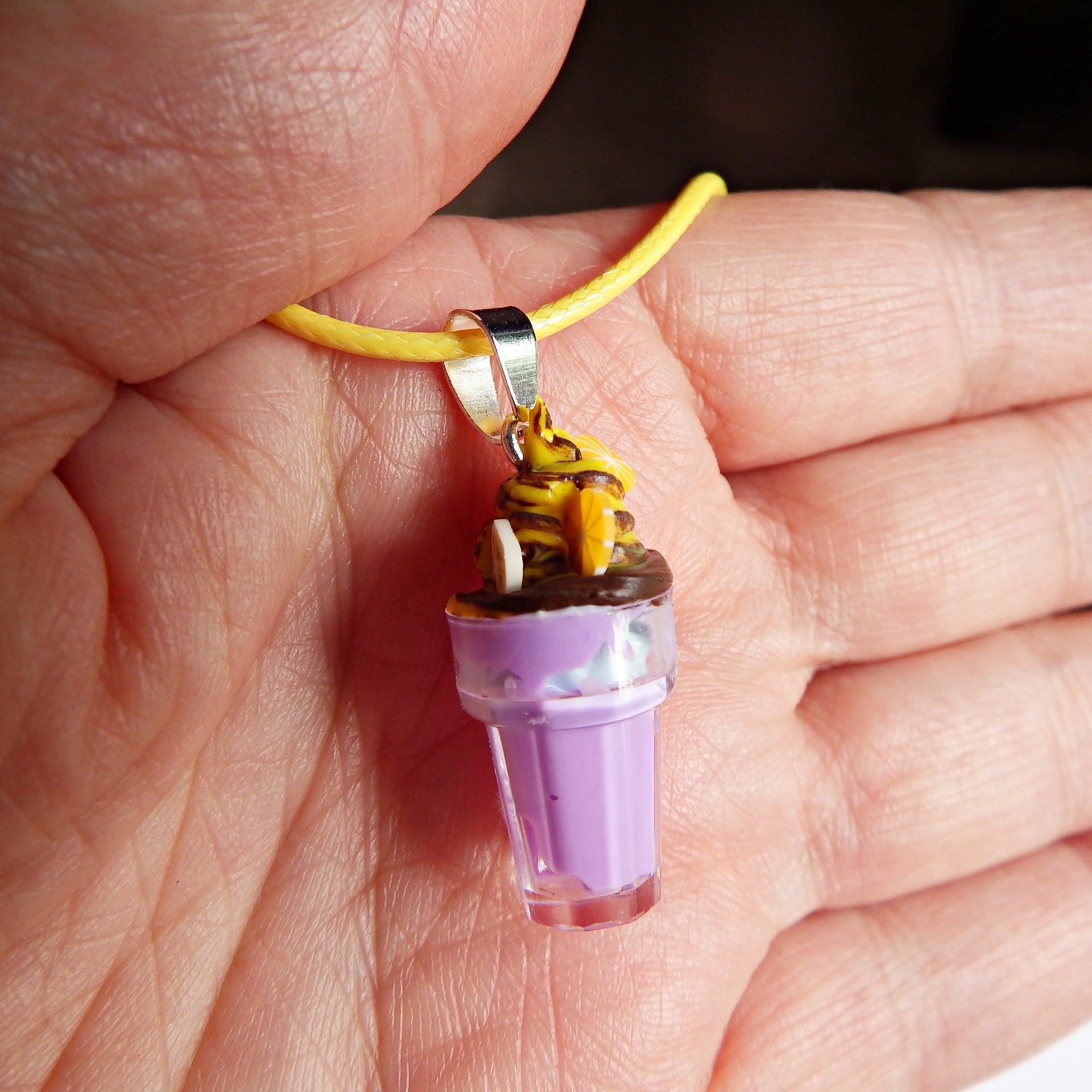 Collier avec pendentif glace, cône ou coupe en plastique avec décoration colle crême et tranches de fruit en fimo. avec cordon coloré et fermoir. Création artisanale unique